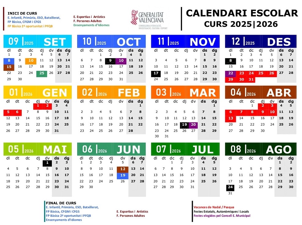 En primer lugar les recordamos que este es el calendario escolar de nuestros alumnos, pero nuestro centro permanecerá ABIERTO en el periodo de NAVIDAD (EXCEPTO los miércoles 25 de dic. y 1 de enero) y en PASCUAS (EXCEPTO del Viernes Santo 3 de abril, Lunes 6 y 13 de Abril). Por otro lado, CERRAREMOS la semana de FALLAS desde el Sábado 14 de Marzo hasta el jueves 19, ambos incluidos.